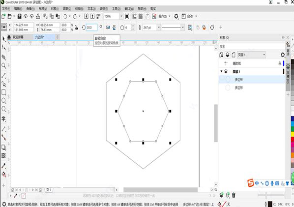 3、主要框架靠两个六边形来完成。我们这里利用快捷键Ctrl+C和Ctrl+V来复制一个六边形,然后用鼠标调整上方工具栏的“缩放比例”即可获得两个中心重合、大小形状一致的六边形了,再调整工具栏中的旋转角度,这里用30度,比较美观。
