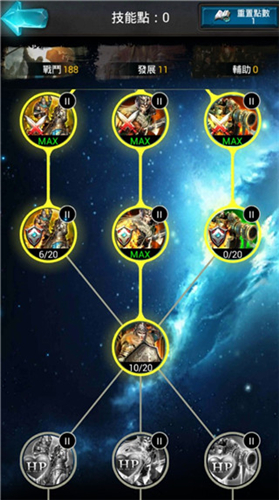 在游戏中领主升级后会获得技能点,用技能点升级相对应的技能可以获得属性提升,领主技能有三个分支,分别是战斗、发展、辅助。