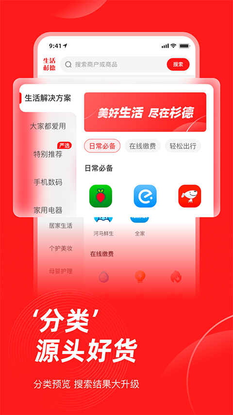 生活杉德app是一款生活百宝箱软件。打开app首页,买东西、缴费、支付全搞定,想购物?家电、数码、美妆、母婴等十多种大类商品随便挑,和逛苏宁、京东一样能搜能比价,要缴费?水电煤、话费、长途汽车票都能交,出门在外还能用电子钱包在全家、星巴克刷杉德卡,连盒马生鲜都能用,方便得不行。