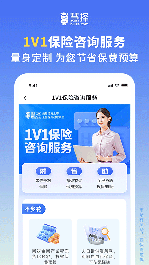 慧择保险app是一款智能保险软件。输入你的生活习惯、预算范围、担忧场景,比如常出差怕意外、担心父母慢性病,系统立刻生成专属保险方案,比如给经常加班的程序员,会推荐重疾险加意外险加定期寿险组合,重点覆盖猝死、工伤等风险,给有孩子的家庭,则会自动计算学平险、少儿重疾险的保费梯度,避免重复投保。