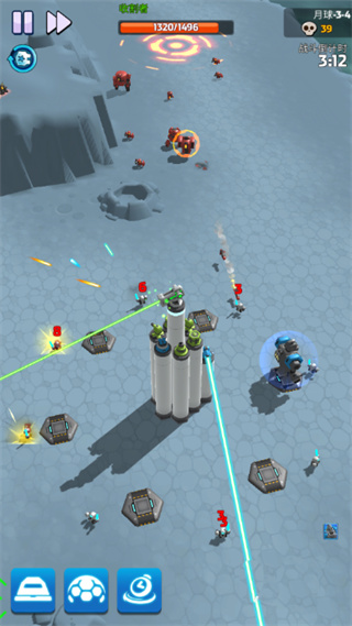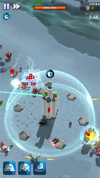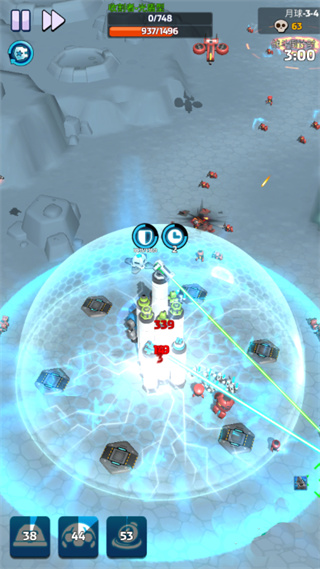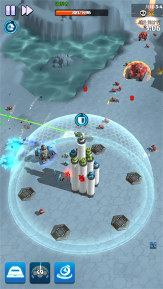 4、当然,玩家娘们及时的开启防护罩可以让其他防御塔避免承受多余的伤害,并且各位也需要在战场当中开始放置各种碉堡来加入战斗。此时敌人的数量依然会越来越多,但玩家的防守阵容已经编排完毕,对方基本上是没有办法进行有效突破的。不过大家需要时刻留意防护罩的能量和技能冷却时间。