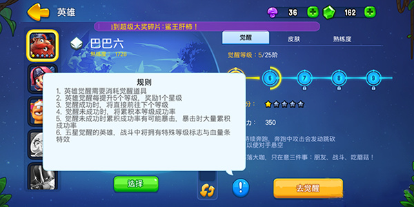 2、英雄在觉醒后可获得全属性加成,需要消耗觉醒道具,且五星觉醒的英雄在战斗中将拥有特殊血量特效和等级标识。觉醒成功的英雄将直接前往下个星级,未成功则会累积幸运值。