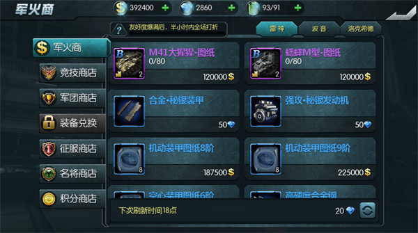 如果觉得过关卡搜集碎片有点慢,或者就差1个或几个碎片就可以合成坦克时,可以去神秘军火商那里转转。神秘军火商的货品每天定时刷新3次,有可能会刷出坦克碎片。那里的东西可是明码标价,去之前可要准备好金币和钻石。