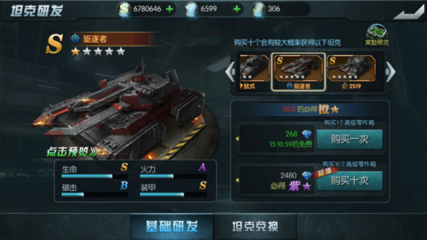 如果觉得神秘军火商卖得东西零散不靠谱,那土豪玩家们请移步商城,花费钻石来直接抽取坦克。