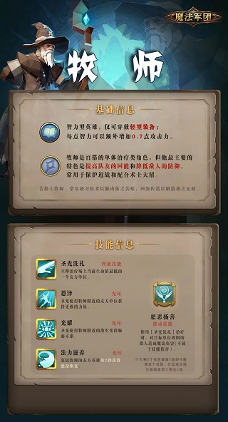 牧师是一位单体治疗类角色。别看他年纪大,他的移动速度也是最慢的… …但这并不影响他在主流编队中的核心地位噢。降低敌方的双抗和提高友方的双抗,再加上单体治疗,让他可以有效保护坦克,另外后面还有一个以火法著称的英雄。有了牧师的回能辅助,她的火焰阵间隔时间就更短了。是故圣教军、牧师、火法英雄,他们常被称为铁三角。