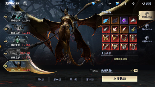 世界BOSS通过玩家等级限制划分成了12层,玩家到达限制等级就可以解锁下一层的高阶BOSS,层数越高等级越高的BOSS对应的会爆出更高阶装备!这里有个小窍门,除了一开始触发世界BOSS玩法的主线任务会指定第一个BOSS外,在装备和战力允许的情况下一定要选择当下等级能解锁的最高层数和最高等级的BOSS,因为更高阶的装备会让你的战力飞速拉升,更重要的是普通玩家一天只有3次机会。当然也可以通过运营活动获世界BOSS卷提高次数,但每一次机会依然很宝贵!