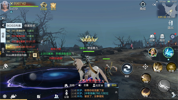 都说有人的地方就有江湖,从世界BOSS第二层开始,玩家之间就会为了争夺BOSS奖励归属开始对抗,奖励归属的判定逻辑很简单,按照击杀BOSS输出伤害排名来定,期间如果玩家死亡没有选择复活继续,则伤害清零!所以在挑战世界BOSS的时候,要么选择没人蹲守的BOSS,要么依靠强大的战力碾压抢夺BOSS奖励归属的其它玩家,当然如果你在行会是一呼百应的团宠,也可以通过召集行会成员按钮,来帮你保驾护航,其后果就是,有可能提前引发一场行会与行会之间的大乱斗。